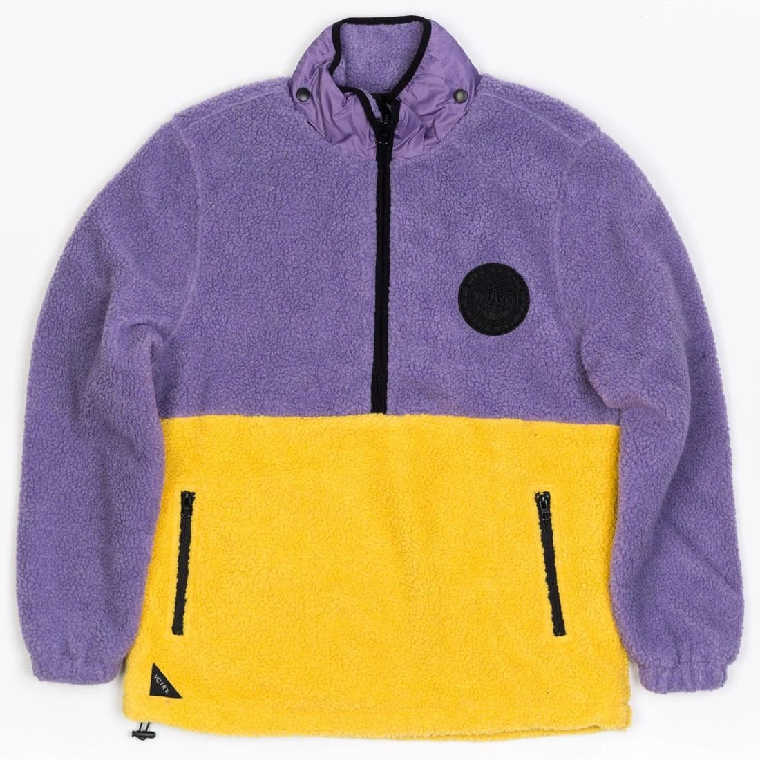 Sherpa fleece 3/4 zip pullover with rip-stop nylon hideaway hood, bungee hem and embroidered felt patch.